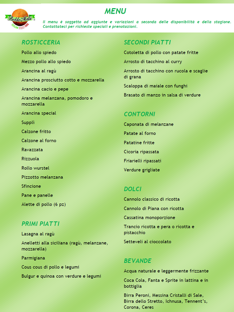 Prepariamo per voi tutti i prodotti, salati e dolci, della tradizione siciliana, dagli arancini ai cannoli, dal "pani ca meusa" alle cassate, dalle panelle allo sfincione. Da noi potrete “tastari” i sapori nati dall’incontro di antiche culture culinarie come quella araba, quella greca e quella normanna, che hanno reso famosa nel mondo l’isola del sole e nostro motivo di orgoglio. Accompagneremo i vostri sensi in un viaggio tra sapori e profumi unici al mondo. Tutto rigorosamente Made in “Bedda Matri”.