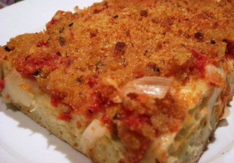 Ingredienti: 1000 g di pasta di pane, Olio d’oliva, 500 g di pomodori pelati, 100 g di formaggio caciocavallo, 2 acciughe, 3 cipolle, Sale, Pepe.